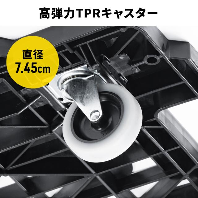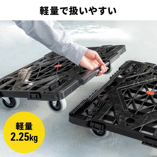 ⇒ご購入の前にご確認下さい連結が可能な耐荷重80kgの平台車。連結できるスタッキング対応で、収納もしやすい。キャスターは高弾力TPRキャスターで、7.45cmの大型サイズ採用の台車。【WEB限定商品】
