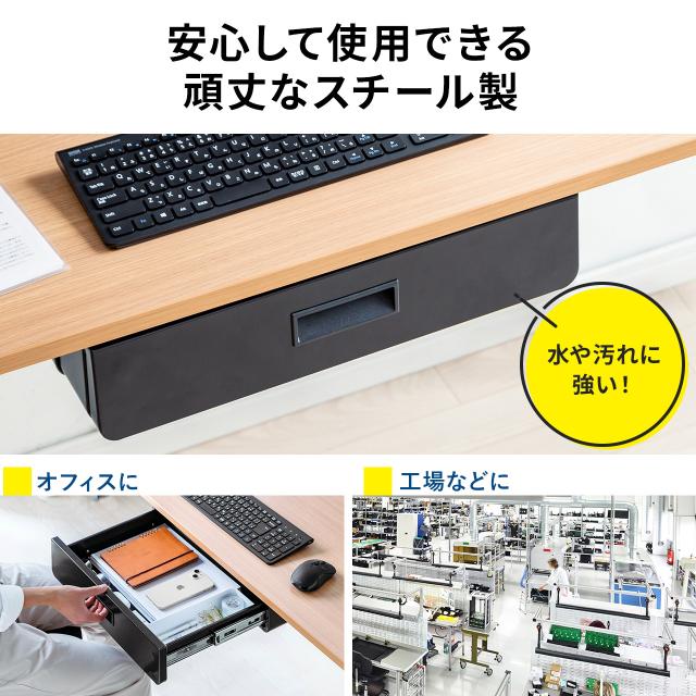 ⇒ご購入の前にご確認下さい天板裏に木ネジで固定ができるデスク下収納ボックス。6.8cmの深い引き出しでたっぷり収納。頑丈なスチール製なので水や汚れにも強く、オフィスや工場など現場でも使える。耐荷重10kg。【WEB限定商品】