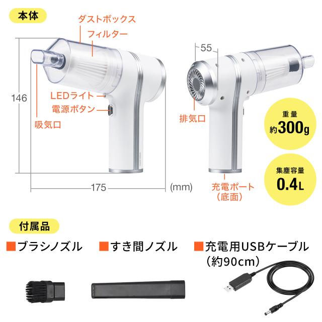 ⇒ご購入の前にご確認下さい軽量でコンパクトサイズの充電式ハンディクリーナー。用途に応じて使い分けすることができるノズル付き。暗い箇所でも見やすくサポートしてくれるLEDライト付きのコードレスクリーナー。【WEB限定商品】