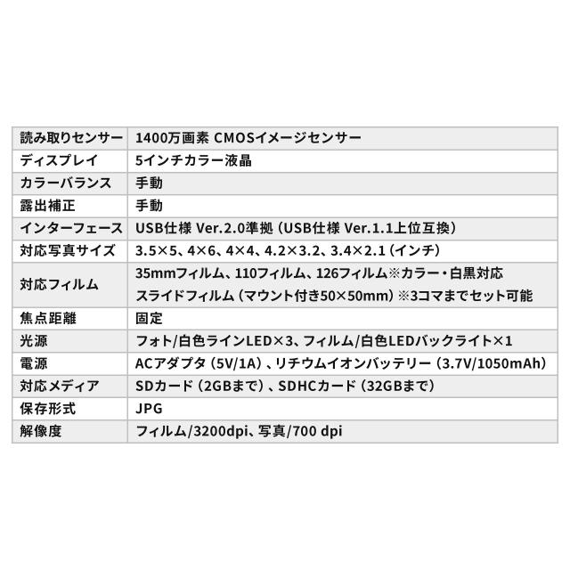 ⇒ご購入の前にご確認下さいネガフィルム(135フィルム/110フィルム/126フィルム)に対応し、ポジフィルムと写真もスキャンできるフィルムスキャナー。お気に入りのフィルムや写真をデータ化できる!HDMI出力可能で、テレビで共有可能。【WEB限定商品】