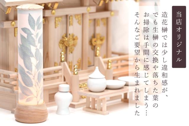 造花榊では少し違和感が、でも生榊の交換や落ちた葉のお掃除は手間に感じてしまう…。そんなご要望から生まれた、当店オリジナル「榊灯」。