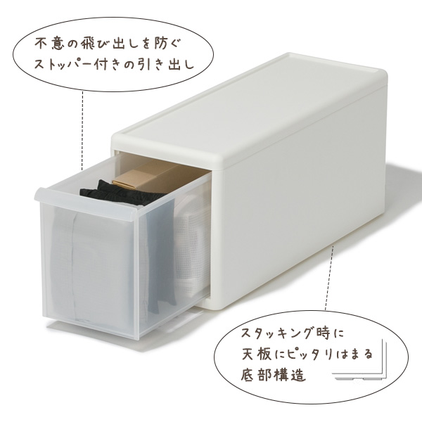 自由に重ねられる設計底部のスタッキング構造により、幅の異なる引き出しをまたいで積み重ねられます。