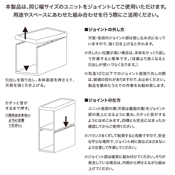 同じ幅ならジョイントも可能天板を取り外すことで、同じ幅の収納ユニットを縦に繋げることもできます。
