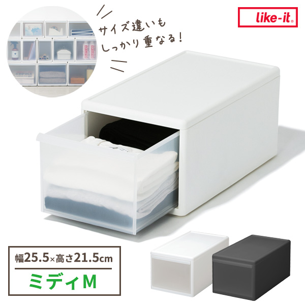 組み合わせて使える収納ケース ミディM / 幅25.5×奥行46.5×高さ21.5cm ホワイト / グレー | ライクイット 衣装ケース 日本製 Like-it 引き出し収納 スタッキング 重ねる 繋げる メタルラック クローゼット シンプル