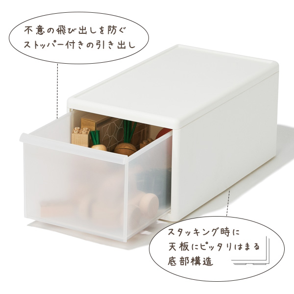 自由に重ねられる設計底部のスタッキング構造により、幅の異なる引き出しをまたいで積み重ねられます。