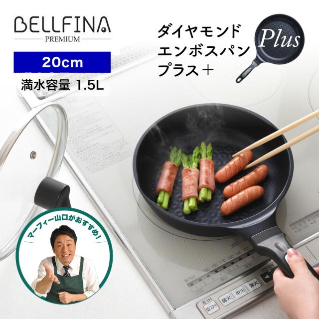 20cm BELFINA ベルフィーナ プレミアム ダイヤモンドエンボスパン プラス plus 蓋付 ブラック テレビショッピングでご紹介 フライパン IH ガス 煮物 軽量 軽い こびりつかない QVC マルチ熱源 蓋 TBS キニナル金曜日 マーフィー山口