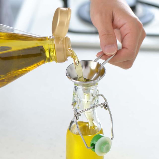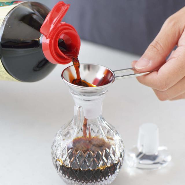 安定した状態で移し替えができる、取っ手付きのろうとです。醤油差しや調味料瓶への移し替えに便利なミニサイズです。
