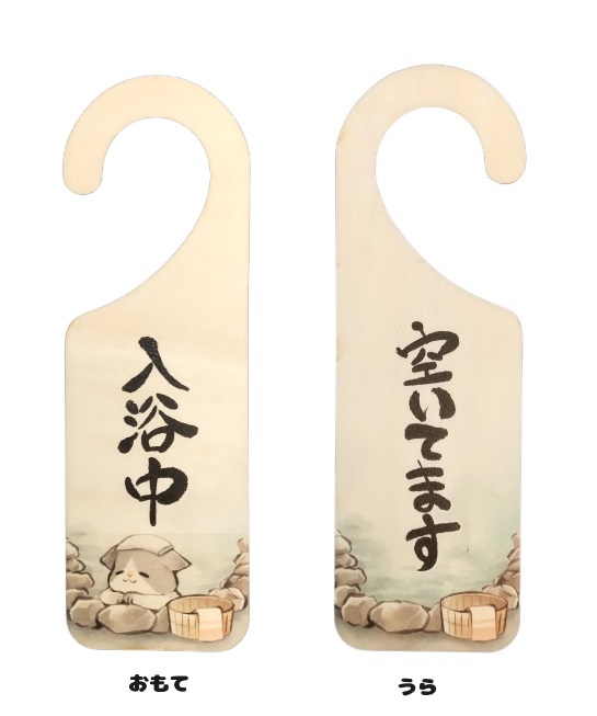 当店オリジナル 両面タイプ 和風 筆絵 イラスト 水彩風 猫 ネコ ねこ 木製 ドアノブ サインプレート 入浴中 お風呂 バスルーム 吊り下げタイプ ドアプレート ドアフック ハンドメイド 送料無料