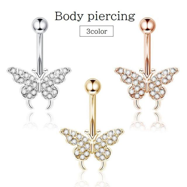 ボディピアス レディース メンズ アクセサリー へそピアス バーベル型 カーブ 蝶 バタフライ ラインストーン キラキラ おしゃ