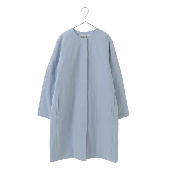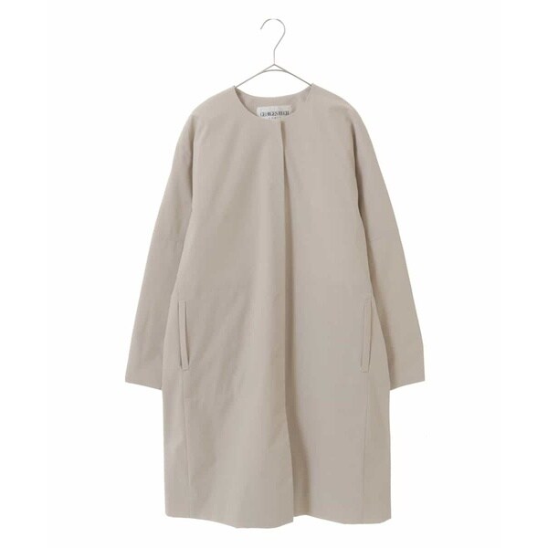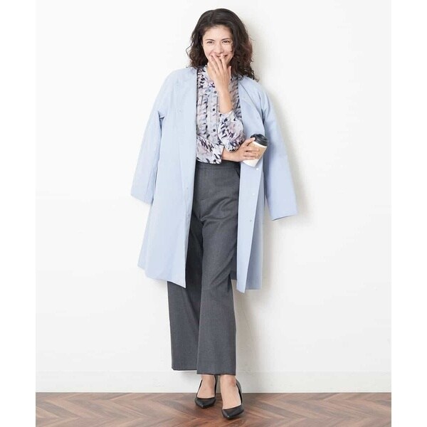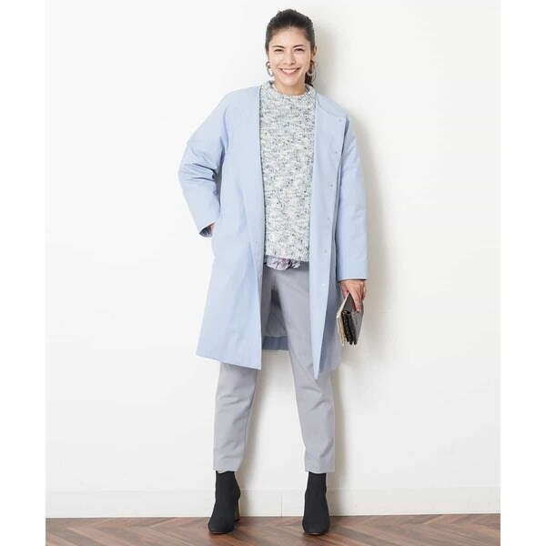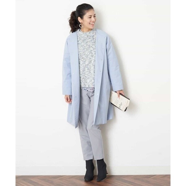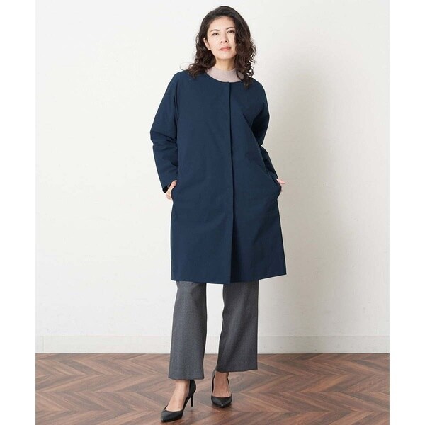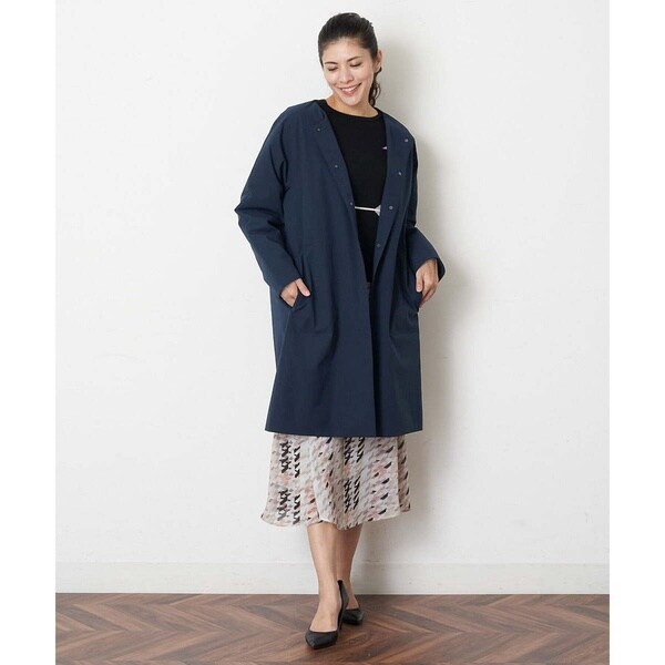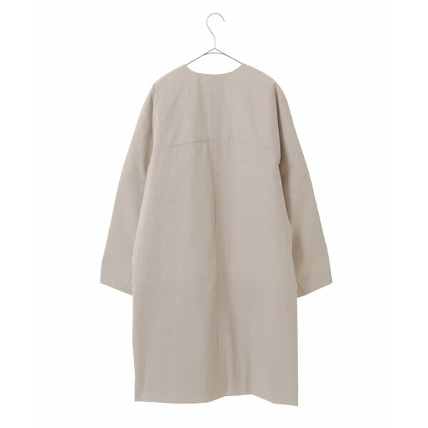 膝丈で着用しています。リラックス感のあるフォルムながらノーカラーのデザインできれいめに着こなせます。後ろの切り替えでバックスタイルのすっきり見えも叶いますよ。