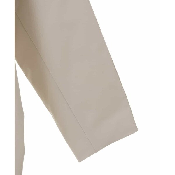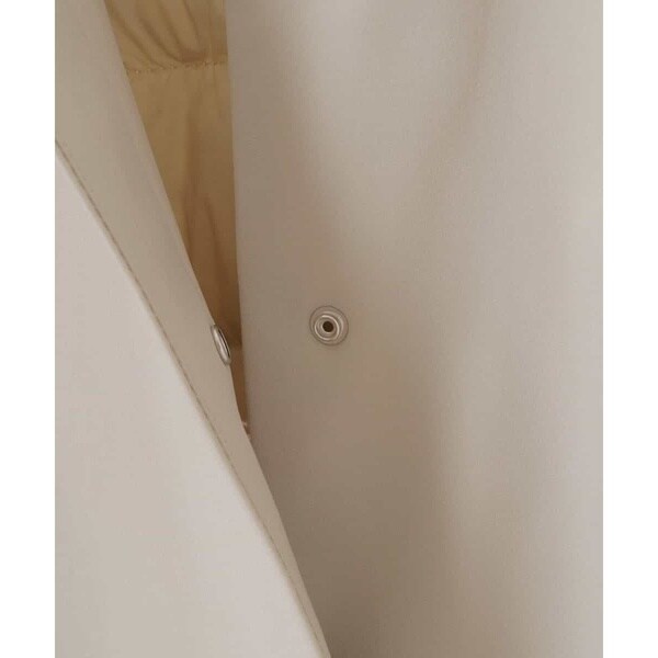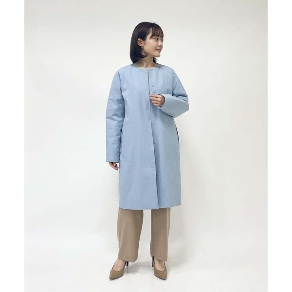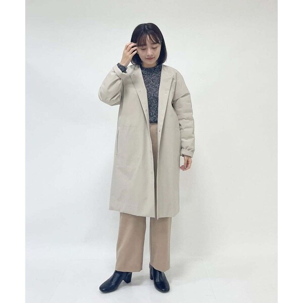 裏側のダウンのステッチが表に響かないよう、ダウン分量と素材感にこだわった冬から春先にピッタリのコートです。総裏仕様で、ダウンは袖と上半身部分に入っています。シンプルなボクシーシルエットで、肘部分まではドルマン袖で袖回りもゆったりとしたデザインです。ゆったりしたサイズ感ですが、着用時に横に広がらないよう3面体で立体的シルエットにしています。前開きは比翼ドット釦。従来のドット釦より小さいサイズで、前を開けた時もスポーティ感を抑えており、きれいめなスタイルに合う上品なデザインです。