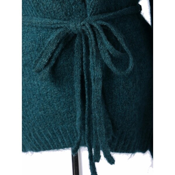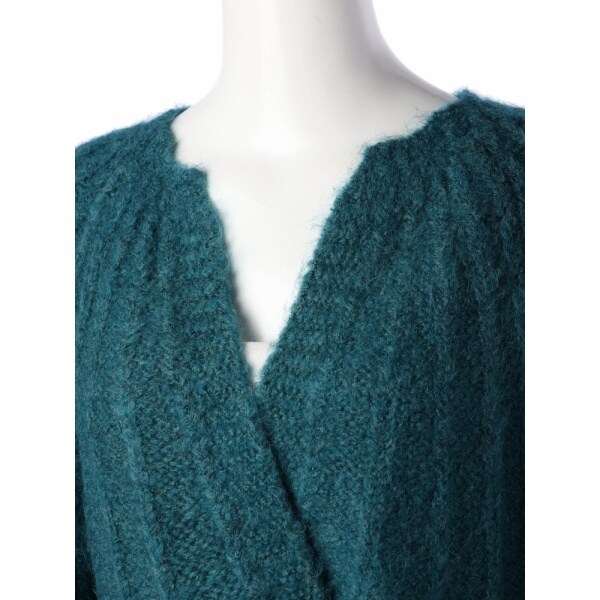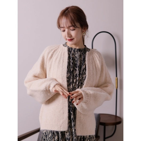 あたたかみのあるふんわり糸をざっくりと編み上げたミドルレングスニットカーデ。