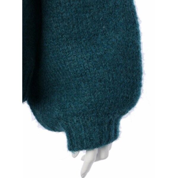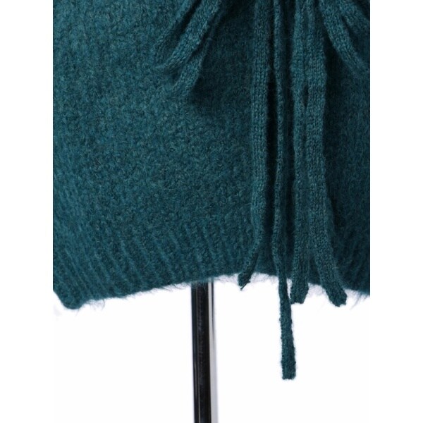 放射線状の立体的な柄編みにより、衿から胸下くまではすっきりとしたシルエット。