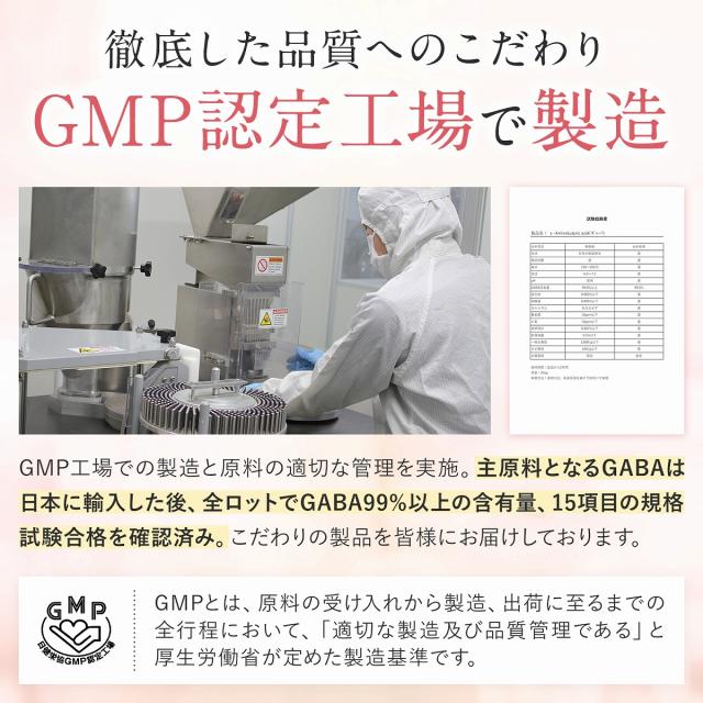 GMP工場での製造と原料の適切な管理を実施。主原料となるGABAは日本に輸入した後、全ロットでGABA99%以上の含有量、15項目の規格試験合格を確認済み。こだわりの製品を皆様にお届けしております。
