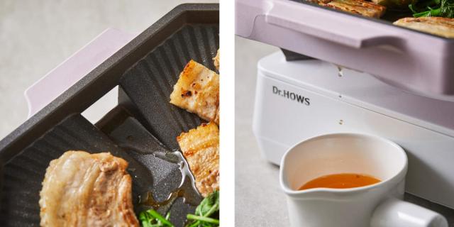 余分な油が落ちやすいよう設計された傾斜と穴があるので、油がとどまりにくくなっています。油の多いお肉もヘルシーに焼け、カリカリでジューシーな焼き上がりになります。また、油はねが少ないので洋服を汚しにくく、安全に料理を楽しめます。