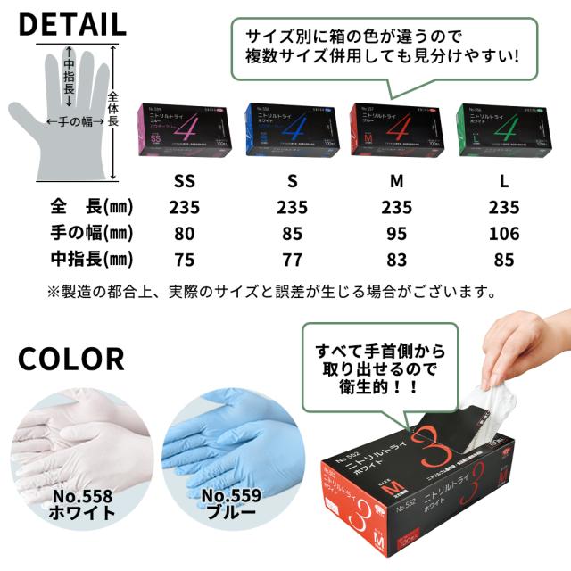 ニトリルトライ4ニトリル手袋 グローブ 1箱 (1箱100枚/50組入り) SSサイズ Sサイズ Mサイズ Lサイズ 粉なし パウダーフリー 左右兼用 食品衛生企画合格商品 使い捨て手袋 使い切り手袋 ゴム手袋 青 水色 白 ブルー ホワイト nito4 宅配のみ