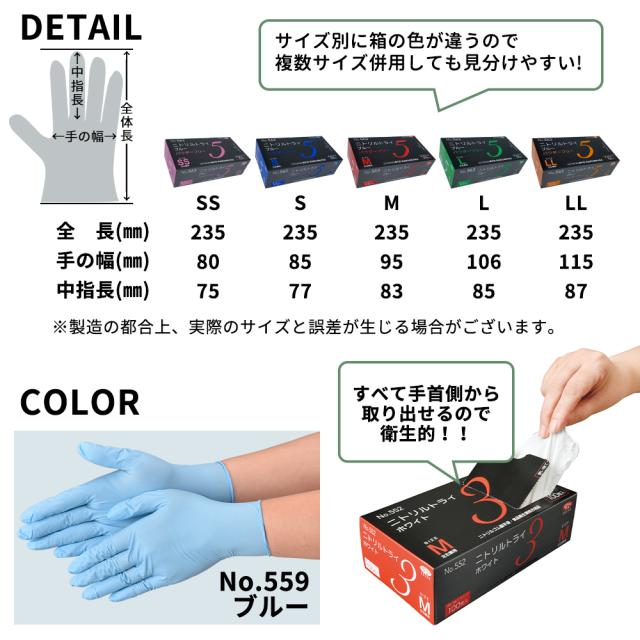 ニトリルトライ5ニトリル手袋 グローブ 30箱 3000枚 (1箱100枚/50組入り) SSサイズ Sサイズ Mサイズ Lサイズ LLサイズ 粉なし パウダーフリー 左右兼用 食品衛生企画合格商品 使い捨て手袋 使い切り手袋 ゴム手袋 青 水色 白 ブルー ホワイト nito5 宅配のみ