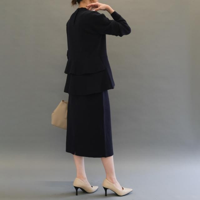 腰周りをさりげなくカバーしてくれる、裾ペプラムデザインの トップスと、 バックスリット入りナロースカートのセットアップ。 程よい厚みで伸縮性抜群の生地だから、ストレスフリーな着心地。 バックのくるみボタンが目を惹くデザインで、後ろ姿もかわいい♪ 単品でも使えるので、コーディネートの幅がぐっと広がります。