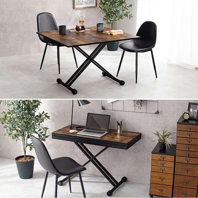 天板の広さが2倍に広がる。ヴィンテージ調のテーブルはロータープからダイニング、デスクタイプまで高さを無段階調節可能です。