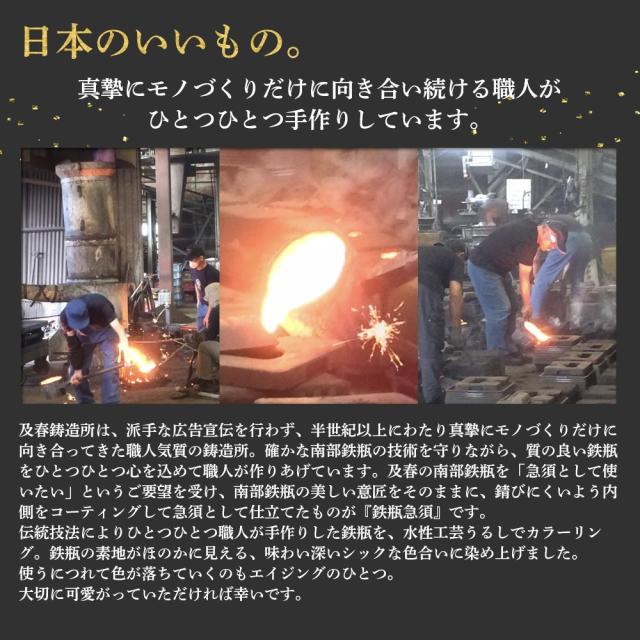 確かな南部鉄瓶の技術を守りながら、質の良い鉄瓶をひとつひとつ心を込めて職人が作りあげています。