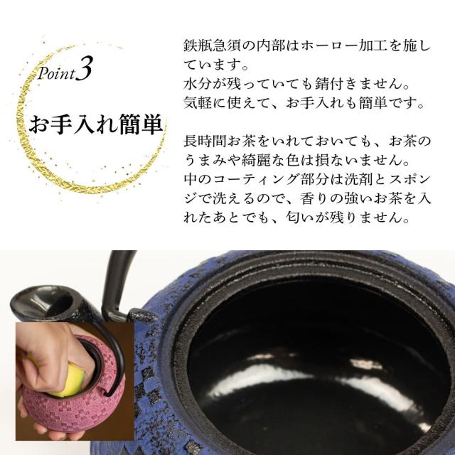 ●急須の内側はホーロー仕上げです。入れたお湯には鉄分が溶出されません。