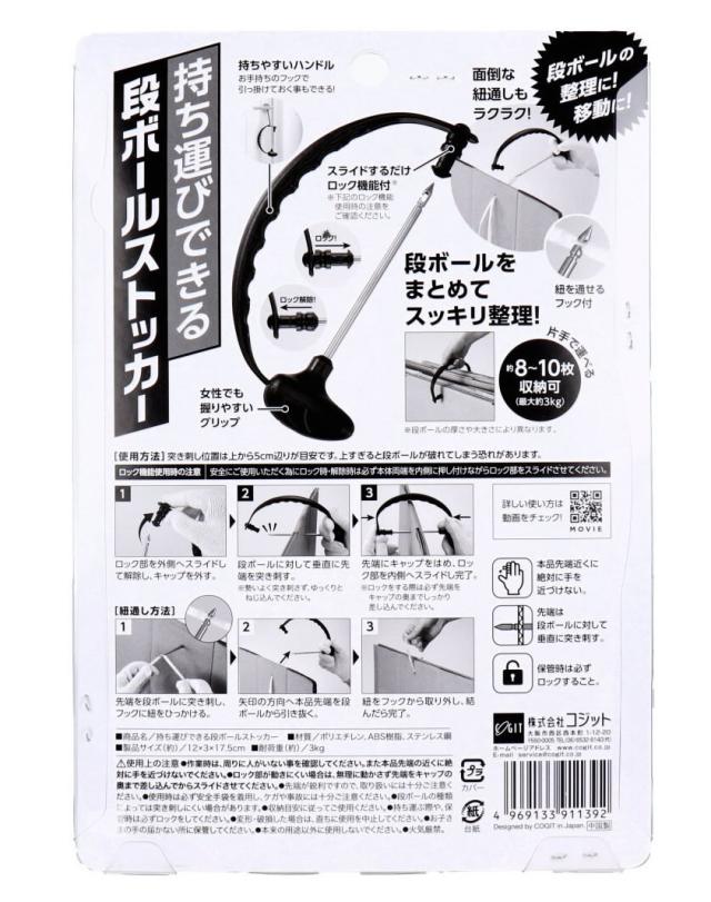 | 商品紹介 | 段ボールの整理に!移動に! 誰でもカンタン!突き刺すだけでダンボールをラクラク整理! ●約8〜10枚の段ボールを1つにまとめる事ができます。 ●グリップは力を入れやすい形状なので、女性でもカンタンに作業ができます。 ●段ボールの大きさに関係なく突き刺してまとめるだけなので片づけの時短にも! ●先端は紐を引っ掛ける事のできるフック型なので段ボールを紐でまとめる時も便利! ●スライドするだけのロック機能付で外れにくい。 |
