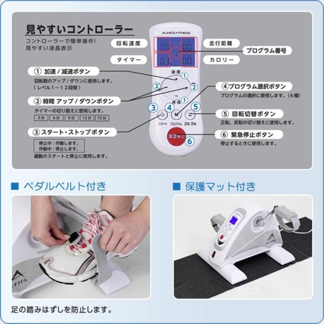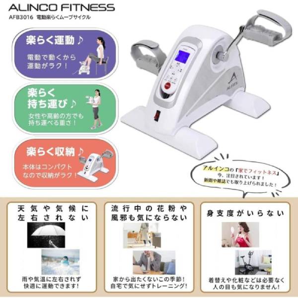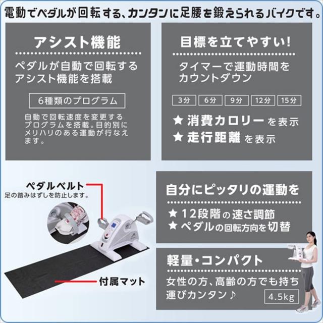 | アルインコ 電動楽らくムーブサイクル AFB3022(2022年モデル) ●アシスト機能付きコンパクトバイク ペダル部分のみのシンプルな電動サイクルです。 自宅の椅子を使って手軽にバイク運動が可能! ペダルが自動で回転するアシスト機能を搭載しているので、足腰が弱くなって自力でペダルを漕ぐ自信がない方も安心。 慣れたら徐々にスピードを上げ、体力アップも図れます。 省スペースで手軽に有酸素運動ができるので、 運動の苦手な人や上半身を引き締めたい女性の人にもオススメです。 ●多彩な使用方法 椅子に腰かけての運動以外にも「テーブルの上に置いて」ペダルを手で回せば二の腕のシェイプアップも可能! さらに「横になった状態」でもバイク運動が出来ます。 スマホや読書をしながら楽な姿勢で下半身の強化が出来ます。 ●リモコンで簡単操作 加速や減速などの調整はもちろん、スタート/ストップやアップ/ダウン、プログラムの選択などがリモコン一つで選択可能です。 LEDランプ搭載で、大きく見やすいのが特徴です。 ●カウントダウンタイマー機能 お好みの目標時間を選ぶとカウントダウンしてくれるタイマー機能を搭載! 目標を立てて運動ができます。 ●軽量・コンパクト コンパクトなのでどこでも手軽に運動ができ、軽量なので女性の方でも移動がラクラク! 使わない時は部屋の隅に保管できます。 ●走行距離・カロリーを表示 リモコンメーター部に走行距離と消費カロリーが表示されるので、運動量がチェックできます。 ※距離カロリー共にあくまでも目安としてご活用ください。 ●ペダルの回転方向変更可能 ペダルの漕ぐ回転方向をボタンひとつで前向き・後ろ向きに変更することができます。 |