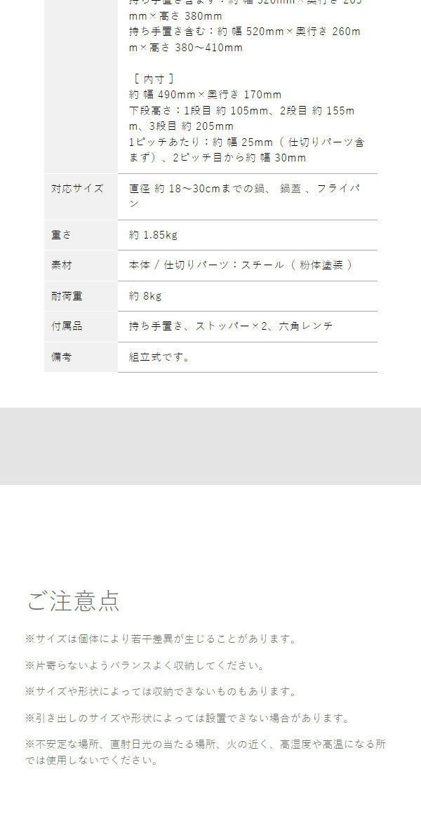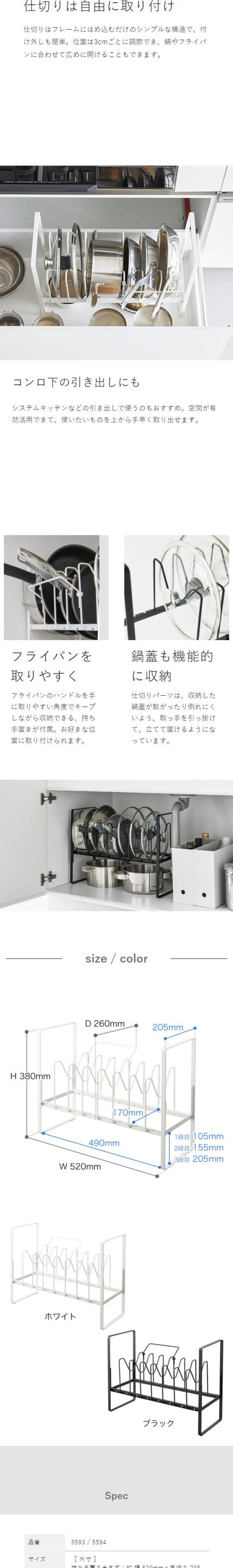 シンク下やシステムキッチンの引き出しなど、キッチンの収納スペースを有効活用。フライパンや鍋蓋を取り出しやすく収納できます。仕切りの位置を変えられて、高さも3段階で調節可能。
