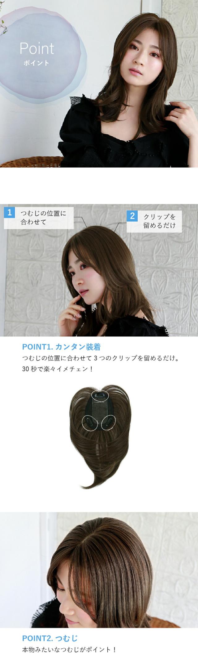 自毛の前髪を両サイドに分けた上に着けるタイプの部分ウィッグです。