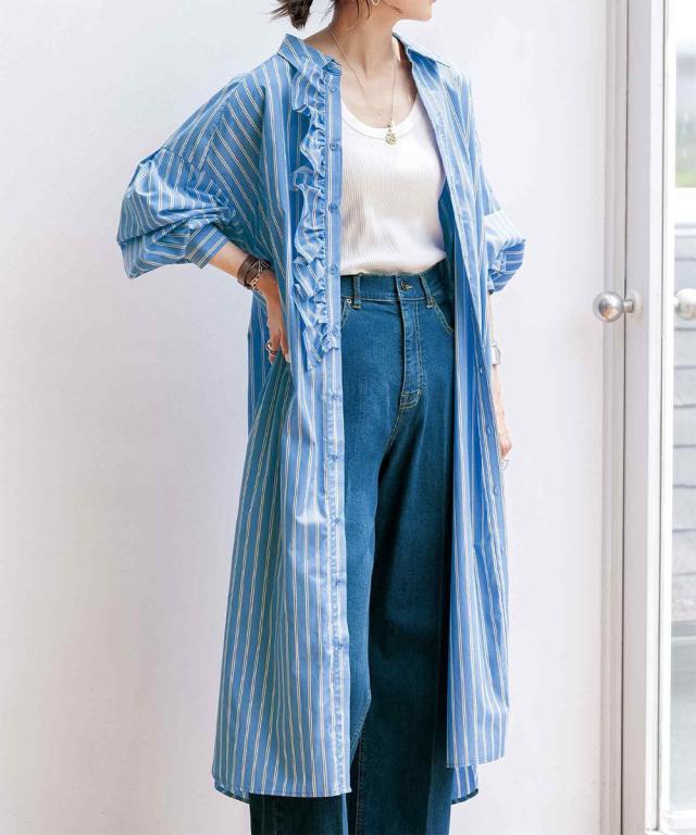 目を惹くストライプ柄と微糖フリルがこの春の推し! ストライプ柄が可愛いさらっとした着心地のシャツワンピ。フロントの甘すぎないフリルがアクセントに。前を全部開けて羽織りとしても着用できるアレンジ利く1着。 綿100% ポケット有 フリル(共布)(取り外し可)
