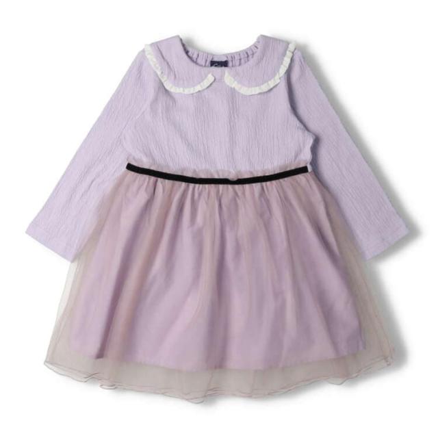 ふんわりチュールのスカートにリボン風の衿も可愛い!ドッキングデザインのワンピース。コーディネートいらずのワンピースは忙しいママにも嬉しいアイテム。さらっと1枚で簡単にオシャレが叶うワンピ。後ろの衿ぐりにはゴムが入っているので、着脱もスムーズ。衿付きのアイテムはきちんと感が出るので、お出かけにもオススメ!【アイテム】長袖 ロングスリーブ トップス シンプル ガーリー フェミニン カジュアル お洒落 オシャレ かわいい 可愛い 普段着 デイリーウェア お出かけ着 お外着 お外遊び着 子ども こども 女児 女の子 ガールズ キッズ ベビーサイズ トドラーサイズ 幼稚園 保育園 小学校 通園 通学 小学生 2023年春物新作 丸高衣料 ラベンダー 薄紫色 パープル ピンク クレセント