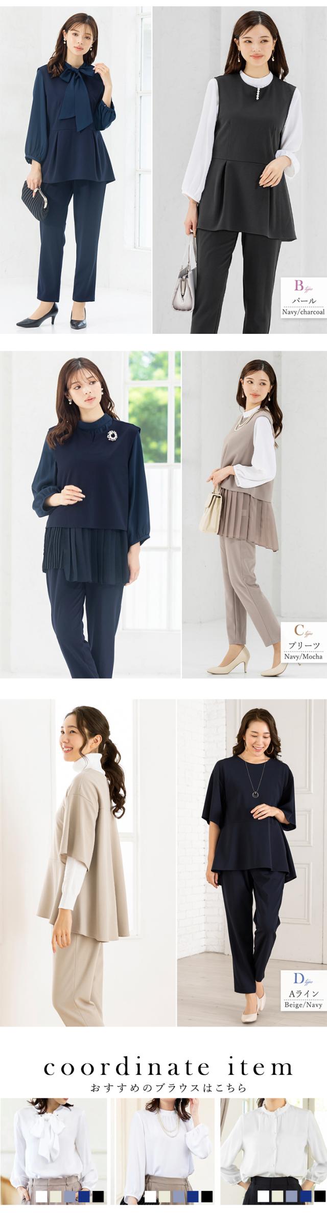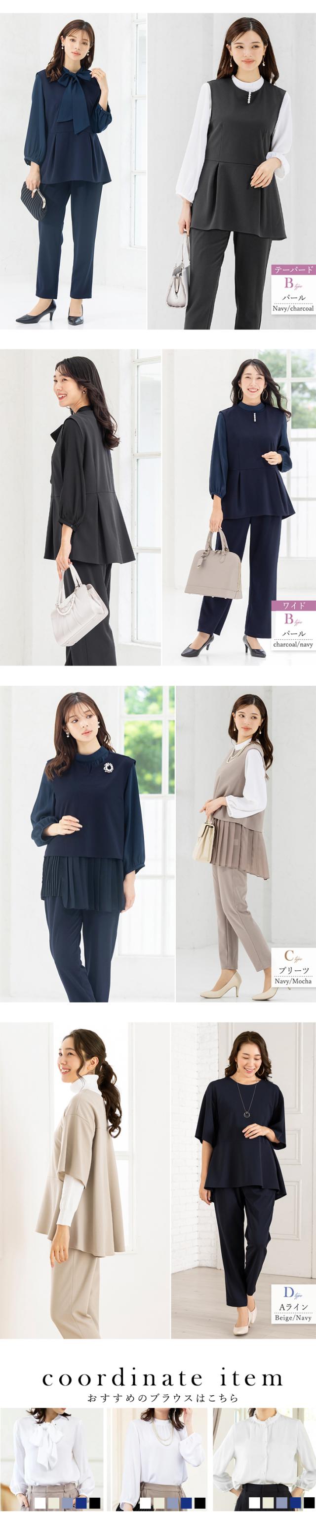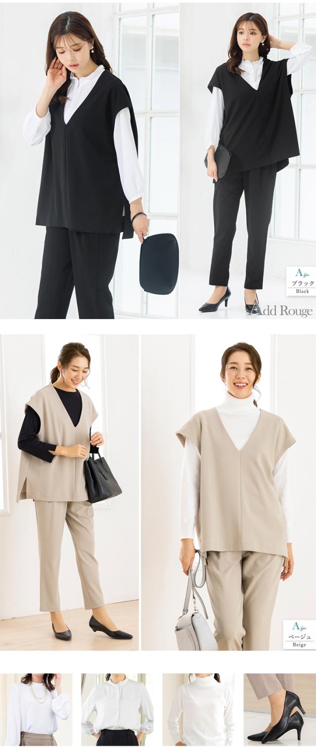 トップスは伸縮自在なストレッチ素材のカットソー。大人カジュアルのベスト、取り外しパール付き、アシンメトリな裾シフォンプリーツ、ゆったりした着心地のAライントップスの4種類から選べます。