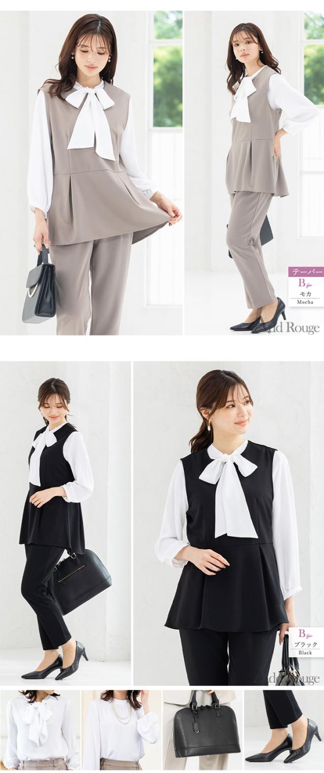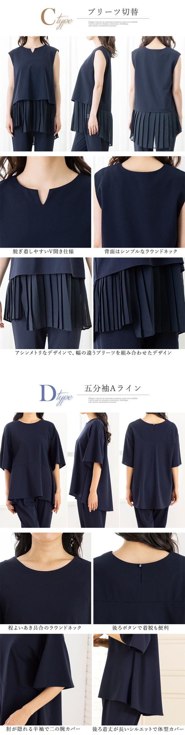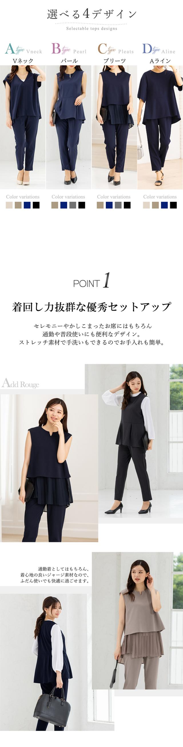 トップスは伸縮自在なストレッチ素材のカットソー。大人カジュアルのベスト、取り外しパール付き、アシンメトリな裾シフォンプリーツ、ゆったりした着心地のAライントップスの4種類から選べます。