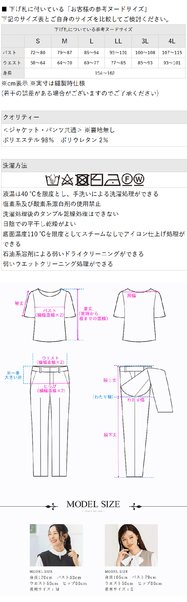 | パンツ | ・テーパードパンツ ・ウエストゴム仕様 ・伸縮性のあるストレッチ素材 ・ご家庭で洗濯OK(洗えるウォッシャブル仕様) |