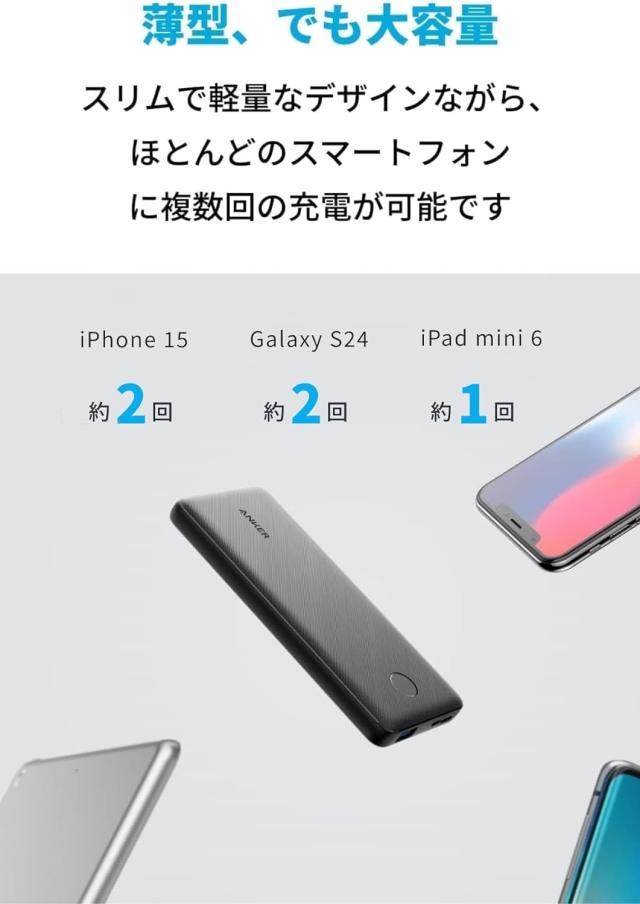 PowerCore Slim 10000は容量に対して驚くほど薄型で軽量なモバイルバッテリーです。ほとんどのスマートフォンに2回以上、タブレット端末に1回以上のフル充電が可能です。約1.4cmの薄さでポケットにすっぽり収まり、仕事や旅行の持ち運び用にも最適です。