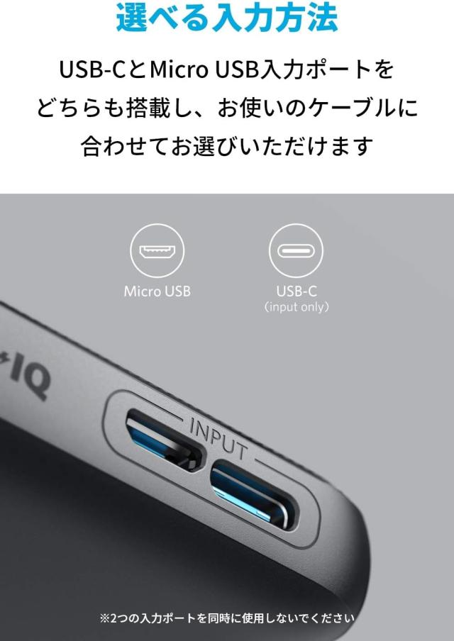 バッテリー本体充電のために、USB-CとMicro USB入力ポートをどちらも搭載し、お使いのケーブルに合わせてお選びいただけます。