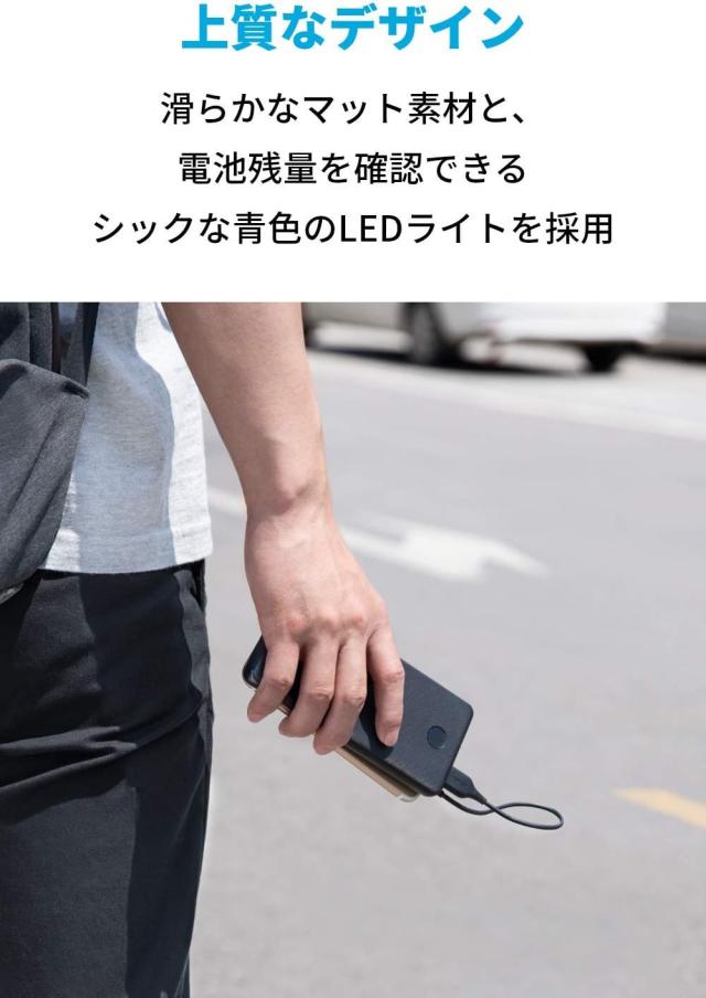 なめらかなマット素材と、電池残量を確認できるシックな青色のLEDライトを採用。内部構造からデザインに至るまで、全ての箇所をプレミアム仕様に仕上げた薄型モバイルバッテリーです。