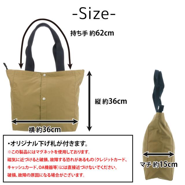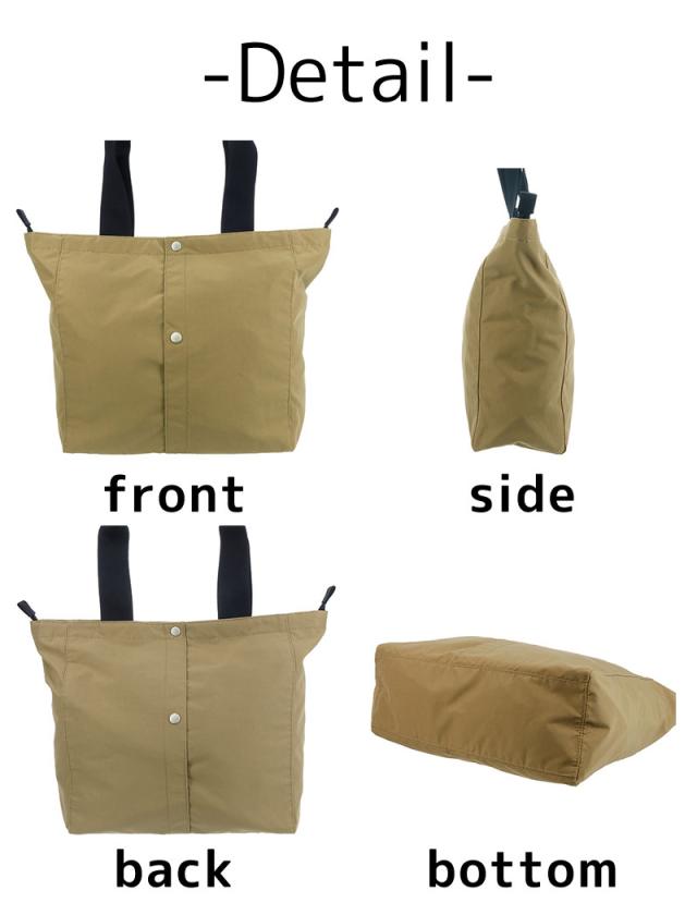 | 素材 | 表:コットンナイロンオックス (コットン60%ナイロン40%) (裏面:アクリルコーティング) 裏:ナイロンオックス (裏面:アクリルコーティング) ポケット部:ナイロンオックス (裏面:アクリルコーティング) | ||