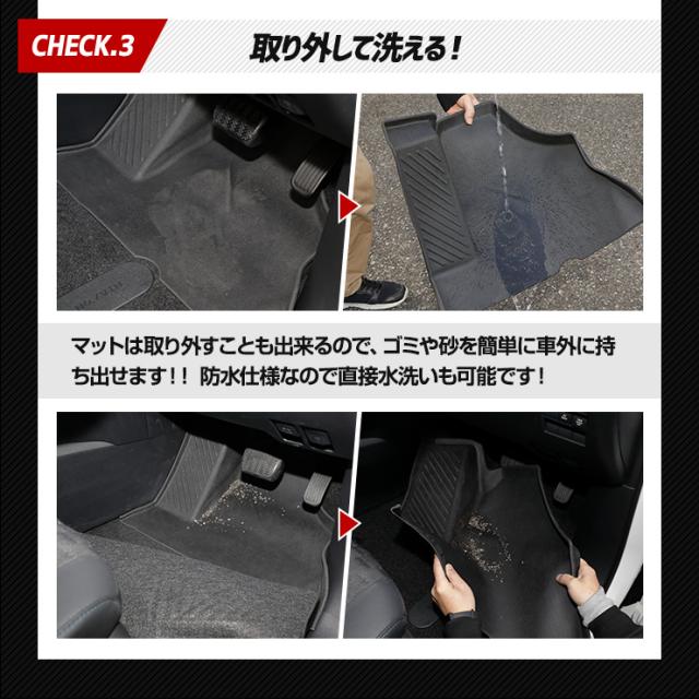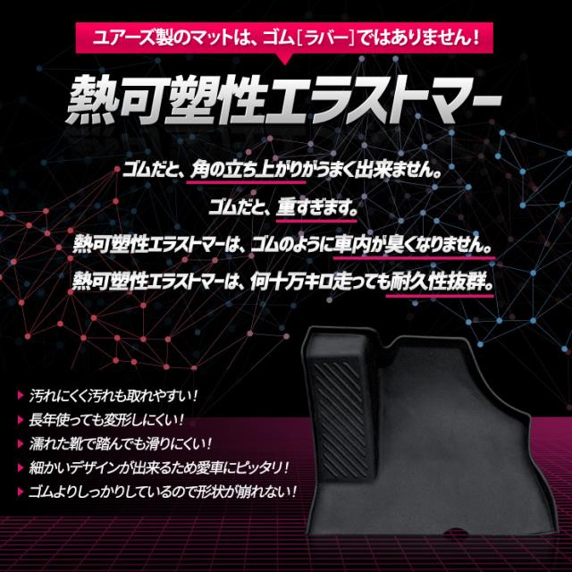 ・フロアをスキャンして製作しているのでピッタリフィット! ・付属のマジックテープで固定するので運転中にマットは全くズレません! ■純正マットの端から落ちるゴミや砂をガッチリガード!! ・隙間なくフィットするので、ゴミや砂が直接車両床に落ちることはありません。 ・3Dデザインなので縁の数センチの立ち上がりで水や汚れをしっかりキャッチ! ■完全防水なのでお手入れも簡単! ・水や汚れは軽いものならウエスなどで拭くだけでOK! ・全面的に汚れた場合は丸洗いも可能なので衛生的です。 ■新素材の熱可塑性エラストマー(TPE)を使用。 ・弾力があり、曲げたりすることも可能なので、お車からの取り外しも容易です。 ・ゴムのように車内が臭くなりません。 ・耐久性抜群なので何十万キロ走っても大丈夫です。 |