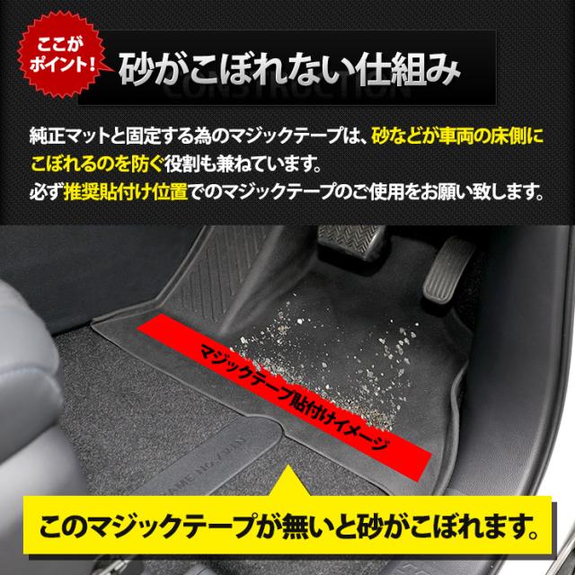 ■元に戻りやすい素材ですので、到着時に型が付いている場合は平らな場所で数日置いてください。 それでも戻らない場合は、ドライヤー温風を当てながら手で反対側に丸めて調整してください。 ■適合車種以外の車両には使用しないで下さい。 ■車両側と純正マットが留具リング(グロメット)などでしっかり固定されているか確認して下さい。 ■本商品と純正マットを固定する付属のマジックテープは必ず推奨位置に貼り付けてご使用下さい。 ■事前にアクセルペダルやブレーキペダル操作を行ない運転操作に支障がないかをご確認の上、ご使用下さい。 |