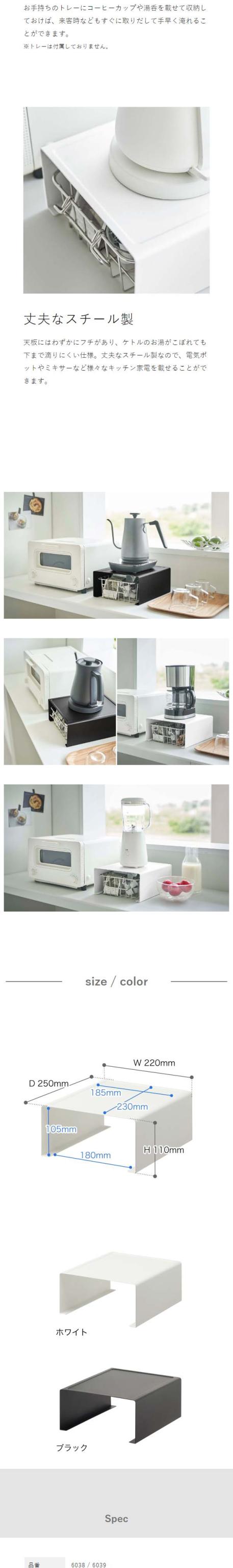 『 tower( タワー )キッチン家電下ラック 』は、電気ケトルやコーヒーメーカーなどのキッチン家電が置けるコの字ラック。ラック下は収納スペースとして活用でき、ティーバッグやインスタント飲料などの細々した物を手に取りやすく収納できます。カップや湯呑などを置いておけば、ティータイムや来客時にも便利。丈夫なスチール製なので、電気ポットやミキサーを置いても◎。カウンターやカップボード上など、キッチンを整頓できる収納ラックです。“ヤマジツ”の愛称で親しまれる山崎実業は、「くらしを整える」商品を提案し続けています。