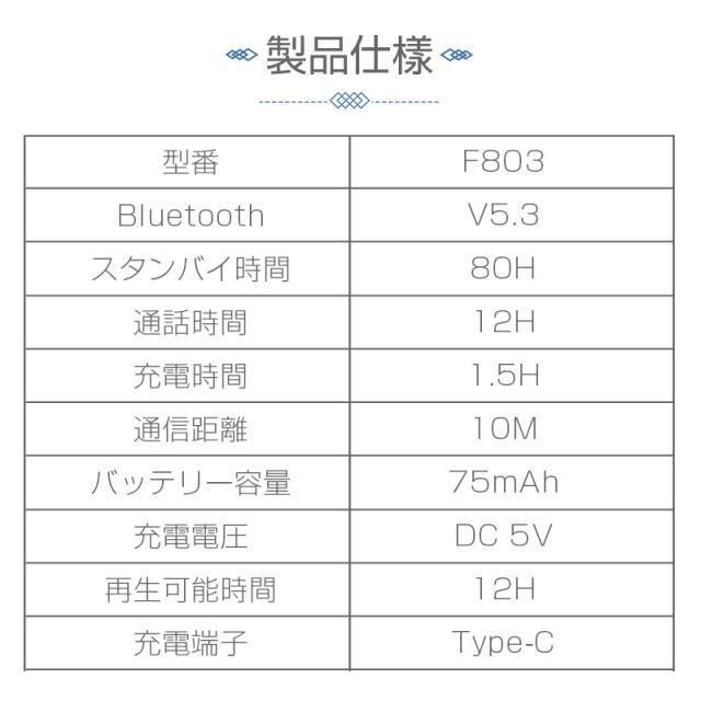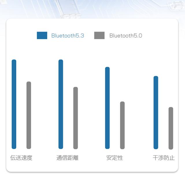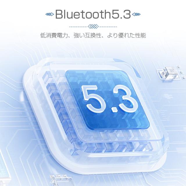 【最新Bluetooth規格】Bluetoothはスマホから電波を飛ばしてイヤホンに音を伝えている為、様々な要因によって音飛びや音途切れを起こすことがあります。そういったリスクを限りなく抑える為に最先端のBluetooth規格のバーション5.3を採用しており、音飛びや音途切れが起きにくくなり、遅延問題を改善されました。さらに消費電力も抑えられるので、長時間の持続作動をサポート!