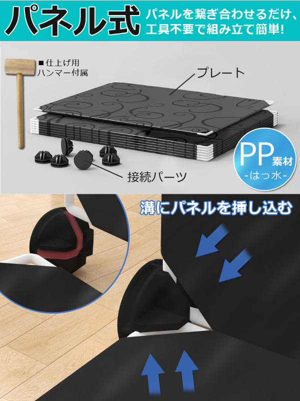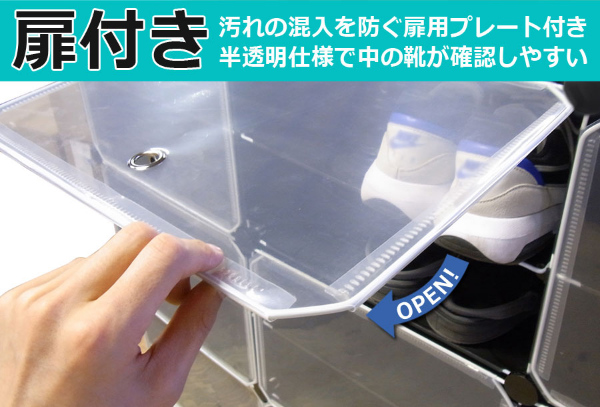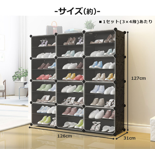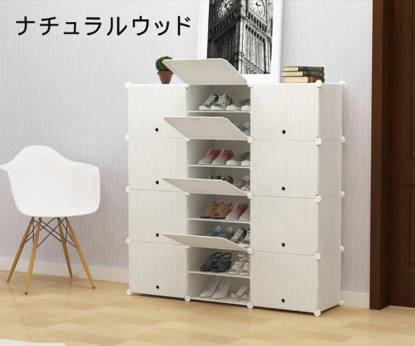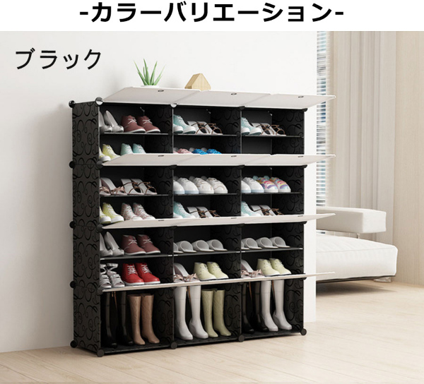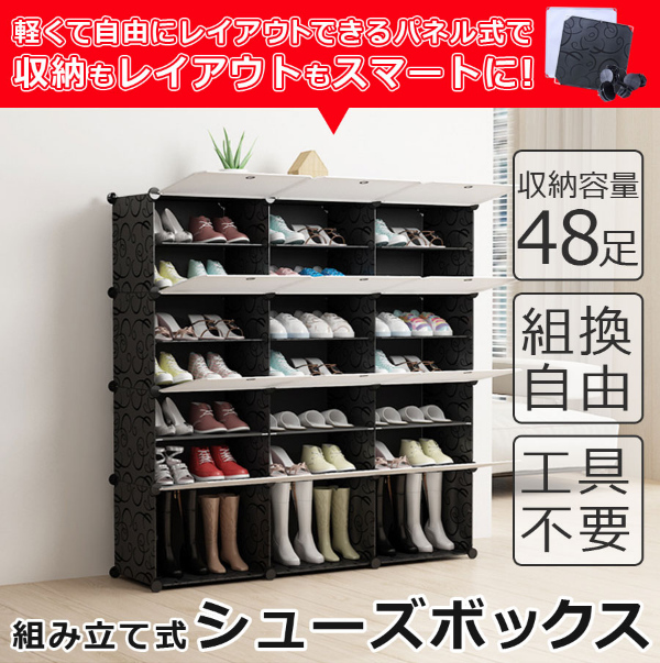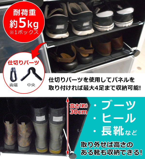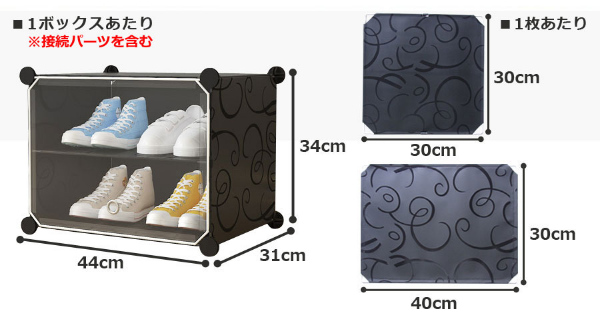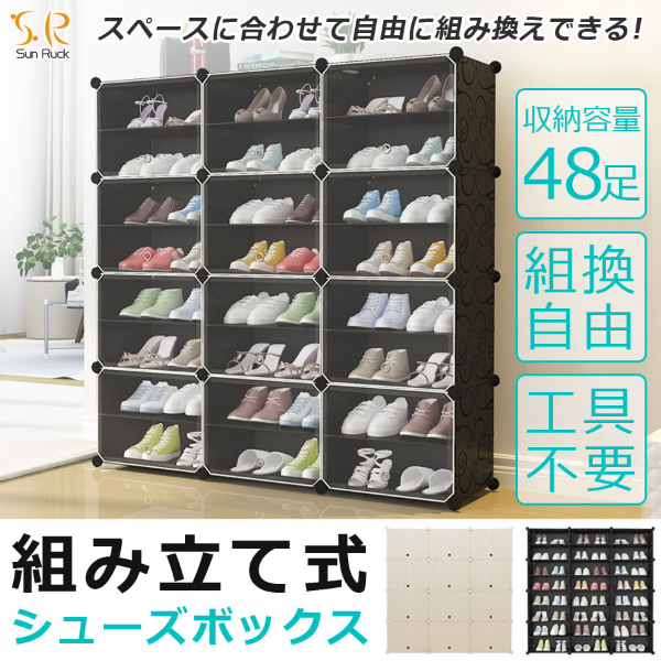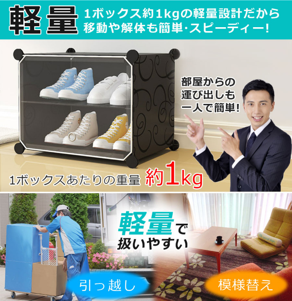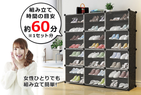 設置場所の環境やスペースに合わせて、ボックスのレイアウトを自由自在に変更可能です。すき間収納やスポット収納に便利!ブロックのようなシンプルなデザインで、1セットあればお部屋の様々な場所に置いて使えます。1セットすべてつなげた状態なら、スニーカーやサンダル、スリッパなど、家族全員分の靴もラクラク収納できる大容量。ボックス内に仕切りを取り付ければ1ボックス4足、1セット分12ボックスなら最大48足まで収納可能。取り外せば、高さ30センチまでのブーツや長靴、ヒールなどの高さのある靴も立てたまま入れることができます。1ボックスごとに汚れの混入を防ぐ扉用プレートが付属。半透明仕様(ブラックのみ)なので、たくさん収納しても中に入れた靴が確認しやすいです。パネルと接続パーツを繋ぐだけでシューズボックスに!女性ひとりでも工具不要で簡単に組み立てできます(1セットの組み立て時間も目安:60分)。レイアウト変更や解体時に便利な仕上げ用ハンマーが付属。パネルには撥水効果のあるPP素材を使用しているため、汚れも付きにくい。
