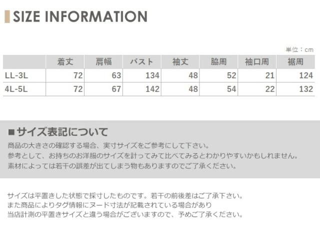 LL-3L:着丈72 肩幅63 バスト134 袖丈48 脇周52 袖口周21 裾周124