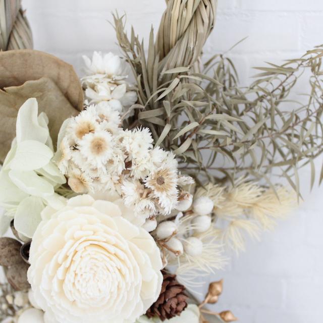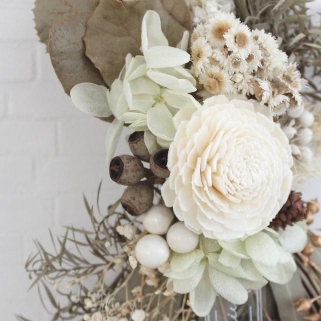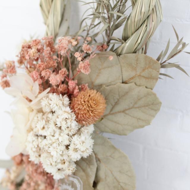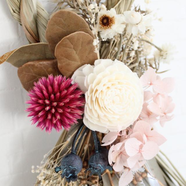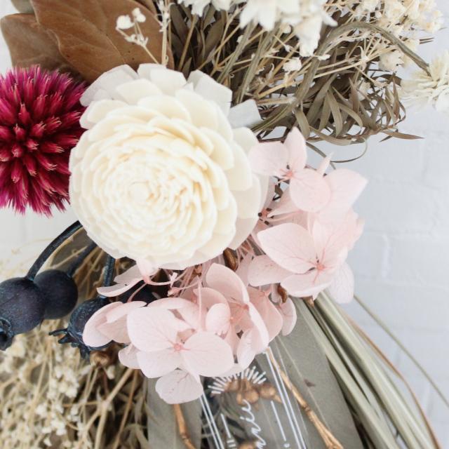 ドライフラワーや淡いカラフルなパーツを使用。可愛くナチュラルな雰囲気です。