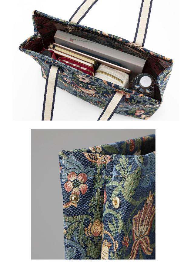 商品詳細: ヘッドデザイナー ヘニー氏によって立ち上げられた英国ブランド。 美しいタペストリーのような織柄で、ゴブラン織の上品さとユニークなデザインを掛け合わせたデザインは年齢問わずお使い頂けます。 A4サイズの書類がしっかり入るため、趣味や習い事などのレッスンバッグとしてもおすすめ。 マチボタンが付いているので、中の荷物の量に合わせて調整できます。 内側はコーティングが施されているので、汚れてしまった時はサッと拭き取れます。