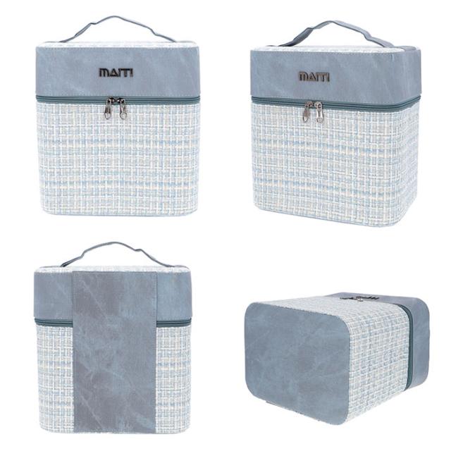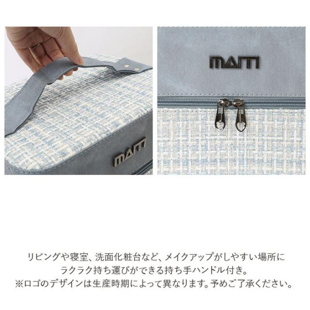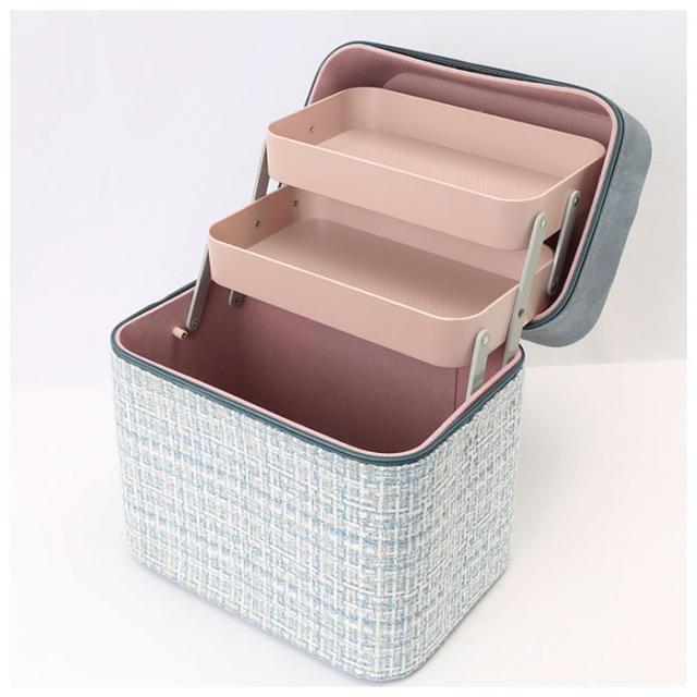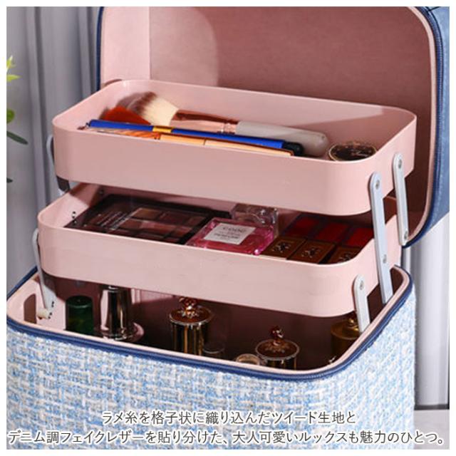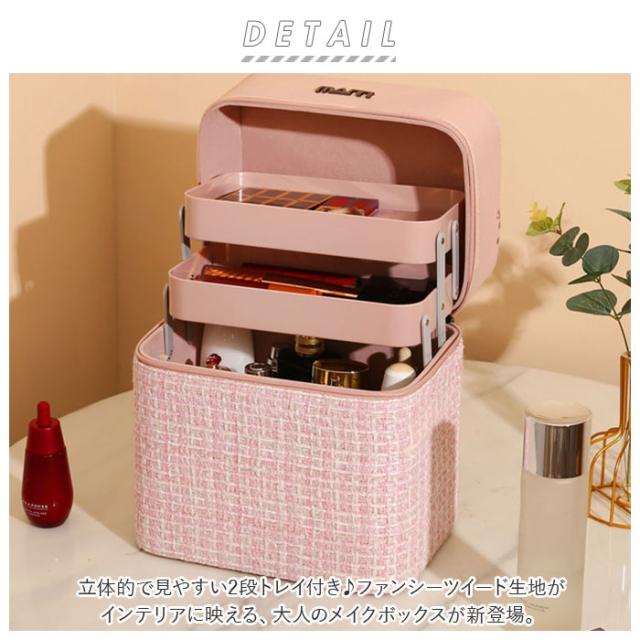 | 商品説明 | ・立体的で見やすい2段トレイ付き♪ファンシーツイード生地がインテリアに映える、大人のメイクボックスが新登場。 ・開口部のダブルファスナーを開放すると、上下2段のコスメトレーがボックス奥に向けてスライドオープンするシンプル構造。 ・たくさんのコスメやアクセサリーを種類ごとに分けて簡単整理!毎朝の忙しいメイク時間でもコスメのストックをサッと見渡すことができて、お目当てのアイテムがすぐに手に取れる♪ ・リビングや寝室、洗面化粧台など、メイクアップがしやすい場所にラクラク持ち運びができる持ち手ハンドル付き。 ・ボックス下部にはしっかりと深さがあり、化粧水ボトルや美容クリーム、ポリッシュのようなネイル用品まで、高さのあるアイテムも立てたまま収納できる大容量設計。 ・ラメ糸を格子状に織り込んだツイード生地とデニム調フェイクレザーを貼り分けた、大人可愛いルックスも魅力のひとつ。 |