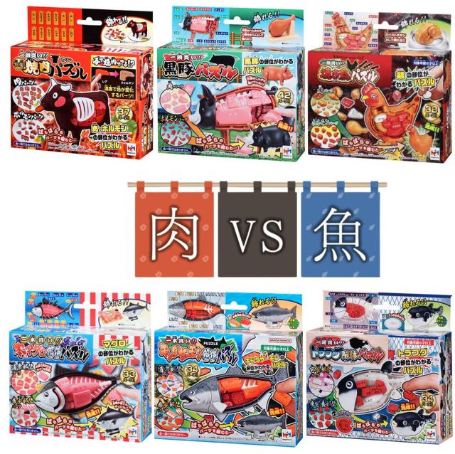 解体パズル【肉vs魚セット】特選焼肉パズル-ウシ & 焼き鳥パズル & 黒豚パズル VS 本マグロ解体パズル & キングサーモン解体パズル & トラフグ メガハウス