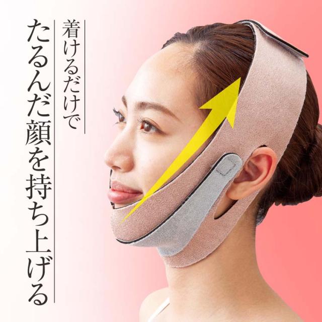 ●顎から頭の上にかけて、ベルトで固定することで物理的に顔をリフトアップ※。