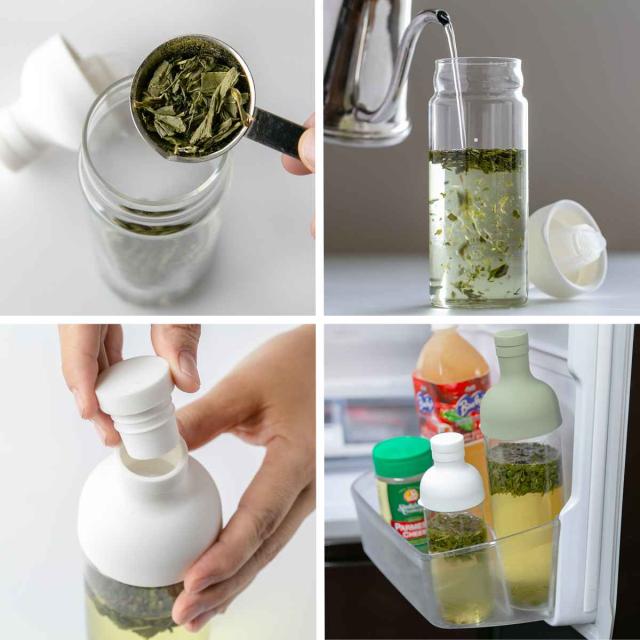 水出し茶を簡単に作れるフィルター付きのボトルです。水出し茶は、水でゆっくり時間をかけて抽出するので、まろやかな味わいになり、茶葉本来の味や香りを楽しめます。夜に作れば、朝には本格的な水出し茶ができているので、素敵な朝時間が過ごせそうです。